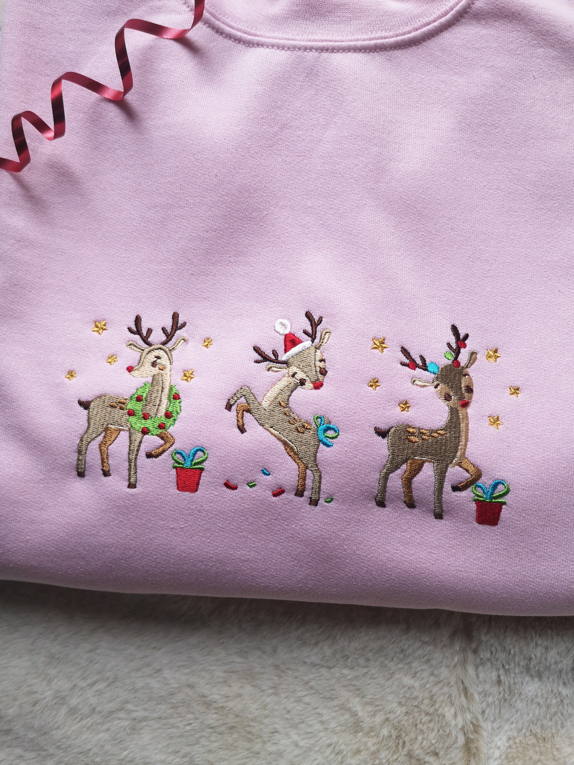 This crewneck features Dancing Reindeer Embroidery design on the front. This Sweatshirt is a great addition to your wardrobe. Our crewnecks are crafted from the highest -quality fabric for an incredibly soft and comfortable fit!
